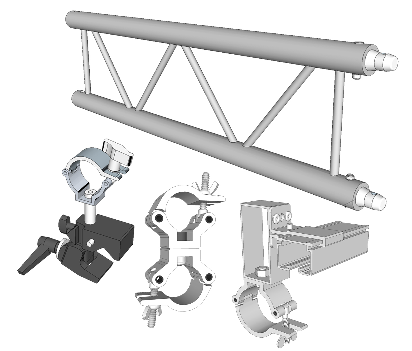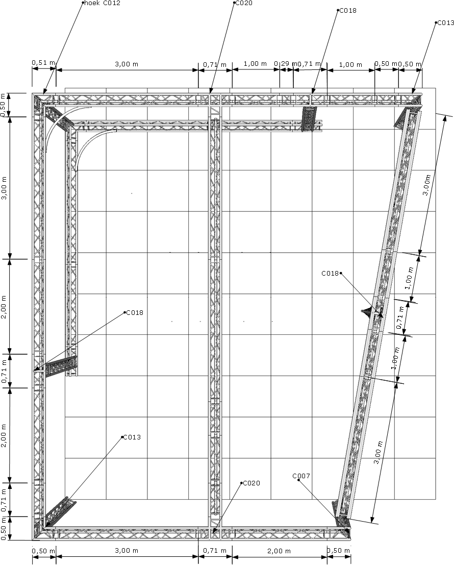 Op huur locaties adviseren wij in veel gevallen een modulaire aluminium kooi -Constructie op basis van een platte, driehoek of vierkant truss. Deze kooi functioneert als het skelet voor alle faciliteiten zoals : green-screen, camera, licht, decor, geluid, en verduistering-gordijnen.